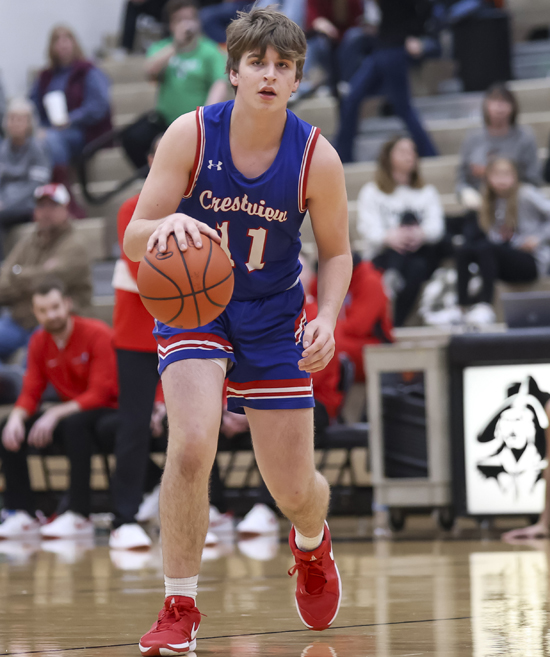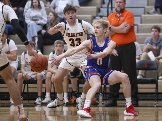 Crestview’s Owen Heckler (above) drilled six three-pointers against Coldwater on Saturday, while teammate Hayden Perrott (below) delivers a pass against the Cavaliers. The Knights won the game 54-51, handing the Cavaliers their first home loss of the season. Wyatt Richardson/Van Wert independent