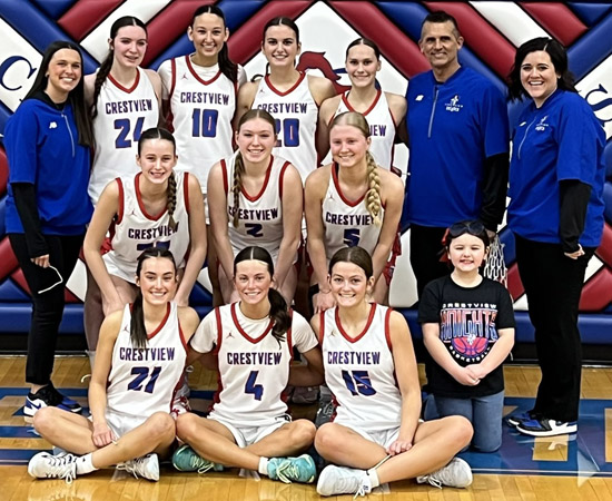 The top seeded Crestview Lady Knights captured a Division VI sectional title with a 51-31 home win over No. 7 Delphos Jefferson on Saturday. Crestview featured a balanced attack and had three players finish in double digits, as Ellie Kline, Peyton Hoffman, and Kaci Gregory had 11,11, and 10 points respectively. Kline added nine assists and Kennedy Crider led the Lady Knights with nine rebounds. Crestview (21-3) will face No. 3 seed Allen East (18-4) in the Division VI district semifinals at 6 p.m. Thursday at Van Wert High School. The second game that night will pit No. 4 seed Wayne Trace against second seeded Columbus Grove. The two winners from Thursday will meet for the district championship on Saturday. Photo submitted
