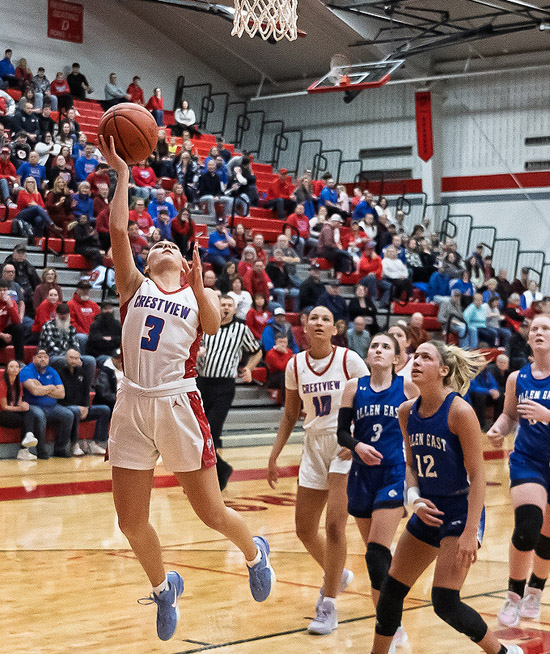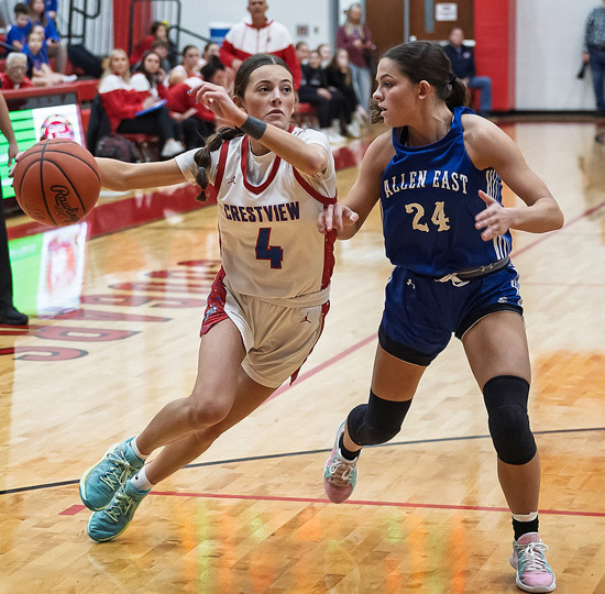 Crestview’s Kaci Gregory (above) goes to the hoop for two points against Allen East and teammate Ellie Kline (belows) drives to the basket during Thursday night’s Division VI district semifinal game at Van Wert. The Lady Knights won the game 36-31 (see story above) and will play Columbus Grove for the district championship on Saturday. Bob Barnes photos