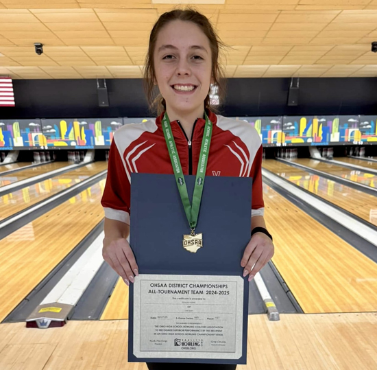 Van Wert High School bowler Reagan Horine is bound for the 2025 Ohio High SchoolState Bowling Championships after finishing first in individual Division I district competition at Star Lanes at the Harbor in Port Clinton on Thursday. Horine, a junior, recorded an outstanding 245-218-202-685 series to advance to state, which will be held at HP Lanes in Columbus next Friday. As a team, Van Wert finished fifth at districts. Photo submitted
