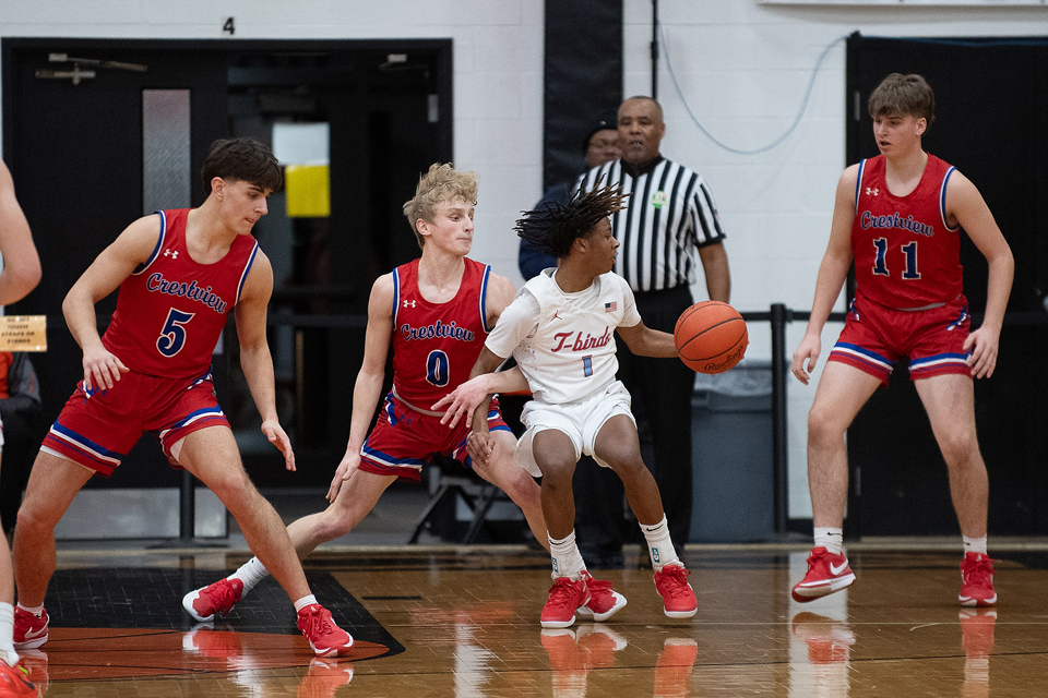 Crestview’s Liam Putman (5), Hayden Perrott (0) and Owen Heckler (11) do their best to stop LCC’s Jeff Williams from getting to the basket. Bob Barnes photo