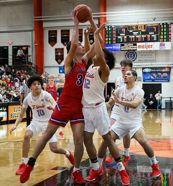 Wren Sheets takes on four LCC defenders as he goes to the basket. Bob Barnes/Van Wert independent
