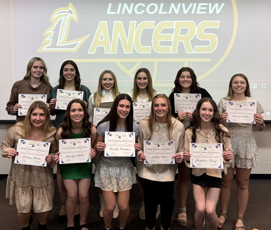 Girls basketball players were honored at Lincolnview’s recent postseason banquet. The Lancers finished the season 13-10 (3-4 NWC) and had a team GPA of 3.79. Shown above are (front row, left to right) team members Destiny Breese Scholar-Athlete Award); Quinlyn Walker (Scholar-Athlete Award); Kassidy Hammons (Scholar-Athlete Award); Ashlyn Price (honorable mention All-NWC, Scholar-Athlete Award, Leading Rebounder Award), and Joey-Kate Carey. Back row: Brooklyn Byrne; Ella Elling (Scholar-Athlete Award); Keira Breese (first team All-NWC, second team All-District 8, Scholar-Athlete, Plus-Minus Award); Annabel Horstman; Avery Zielke, and Emerson Walker (second team All-NWC, Scholar-Athlete Award, Lady Lancer Award). Photo submitted