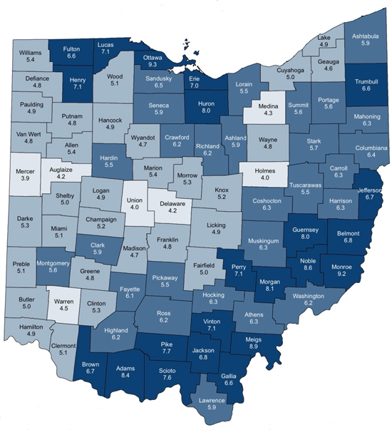 The counties with the highest unemployment rates in February were Ottawa County (9.3 percent), Monroe County (9.2 percent), Meigs County (8.9 percent), Noble County (8.6 percent) and Adams County (8.4 percent). ODJFS noted three other counties had jobless rates at or above eight percent – Morgan County (8.1 percent) and Huron and Guernsey counties (8.0 percent).