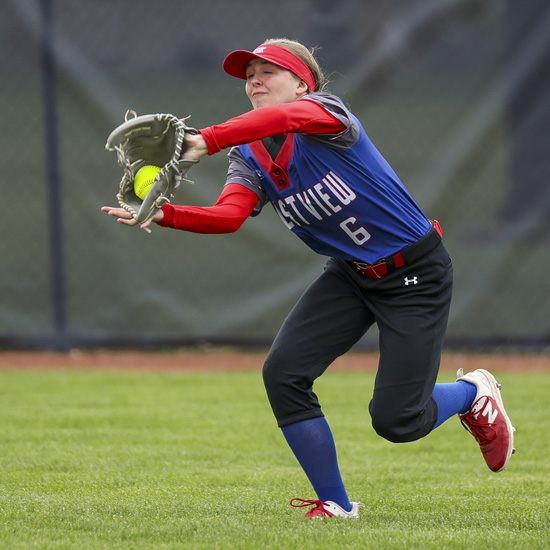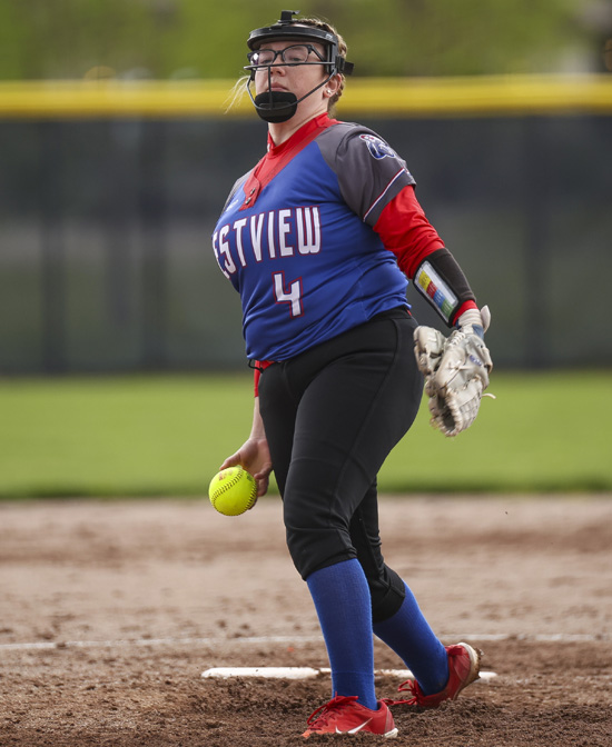 Crestview’s Kylie Williams (above) makes an outfield grab during Thurday’s Division IV district semifinal game vs. Tinora at Archbold. Below, Alli Thatcher (below) hurls a pitch against the Rams. Unfortunately for the No. 8 seed Lady Knights, the 2025 softball season came to an end with a 9-3 loss to No. 6 seed Tinora. Thatcher and Emma Ward each drove in a run for Crestview (9-15). Wyatt Richardson/Van Wert independent