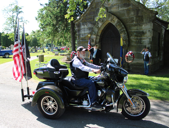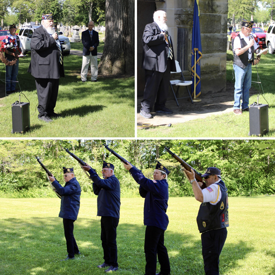 Van Wert American Legion Post 178 held its annual Memorial Day ceremony at Woodland Cemetery Monday morning (see story above). Pictured are Post 178 Commander Randy Matthews (top left), American Legion Chaplain Marc Rucklos (top right), a 21-gun salute and the Legion Riders presenting the colors. Scott Truxell/Van Wert independent