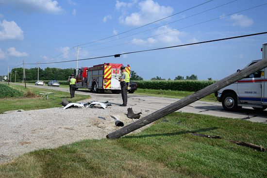 Convoy Fire and EMT units were called to a single vehicle accident at the intersection of Convoy Rd. and Liberty Union Rd. at approximately 5:15 p.m. Sunday. A car that was eastbound on Convoy Road appeared to have gone left of center before leaving the roadway. It struck a mailbox, then a utility pole and a pipe in the yard. It crossed back over the roadway and traveled another 150 feet onto the eastbound grassy right of way before coming to a stop. One person was injured and transported to OhioHealth Van Wert Hospital. The Van Wert Post of the Ohio State Highway Patrol investigated the accident. Bob Barnes/Van Wert independent