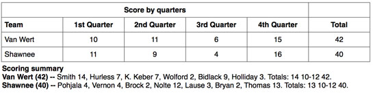 Free throw shooting down the stretch was the key as Van Wert made 7 of 8 from the line in the final minute of play, including 6 of 6 from AJ Smith, the game’s top scorer with 14 points overall. Matt Bidlack added 9 points on a perfect 4-for-4 performance from the field, while Joey Hurless and Kyle Keber each had 7 points on the night. Joey Thomas led Shawnee with 13 points, while Tom Nolte added 12 points for the Indians. No other Shawnee player had more than 4 points on the night.