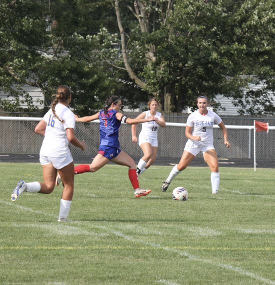 Ellie Ward (in blue) scored a goal but it wasn’t enough as Crestview fell to Delphos St. John’s 4-1 on Tuesday. Ward finished with six shots on goal and Dakota Thornell had 20 save. Crestview (0-2) will play at South Adams (IN) on Monday. Photo submitted