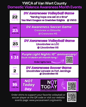 Throughout the month of October, the Van Wert County Courthouse, Municipal Court Building, and numerous local homes and businesses will be illuminated in purple as a visible reminder of the community’s commitment to ending domestic violence. These lights serve not only as a tribute to victims and survivors but also as a beacon of hope for those currently in abusive situations reminding them that help is available through YWCA Survivor Services.