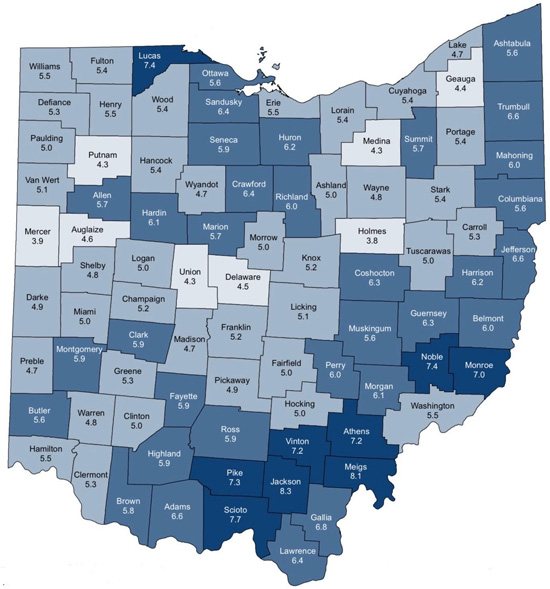 Eight counties had unemployment rates above 7.0 percent in July, primarily in southern and southeast Ohio, with one exception – Lucas County. The counties with the highest rates, other than Jackson, were: Meigs, 8.1 percent; Scioto, 7.7 percent; Lucas and Noble, 7.4 percent; Pike, 7.3 percent, and Athens and Vinton, 7.2 percent.