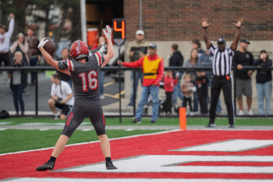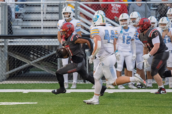 Xavier Kelly (above) zooms for yardage against Bath, while Geary Hilleary (below) celebrates after catching a touchdown pass against the Wildcats. Bob Barnes/Van Wert independent
