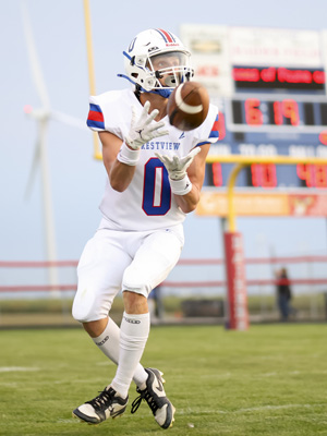 Perrott’s two touchdowns came in the second quarter, one on a 48-yard pass from Huxley Grose, who completed 7-of-9 passes for 131 yards, and the other on a 51-yard interception return. In addition, Perrott was 6-of-7 on extra point attempts. The interception was one of two thrown by Wayne Trace quarterback Jack Schoenauer, who completed 14-of-26 tosses for 146 yards.