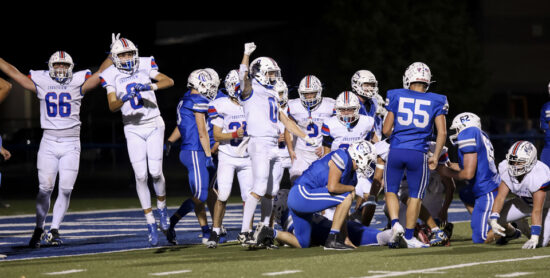 Crestview’s defense celebrates after stopping an Allen East two point conversion attempt with 30 seconds left in Friday night’s game. The stop clinched an exciting 34-33 win by the Knights. Van Wert also won Friday night, defeating Defiance 36-27. Game stories can be found on the Sports page. Wyatt Richardson/Van Wert independent