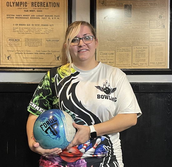Britany McMichael is all smiles after bowling a 300 game at Olympic Lanes Monday night. Photo submitted