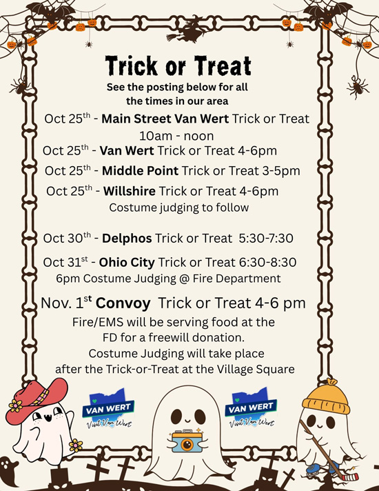 Visit Van Wert has put together this handy list of local trick-or-treat times. Seven different local trick-or-treat events are included on the list. Photo submitted