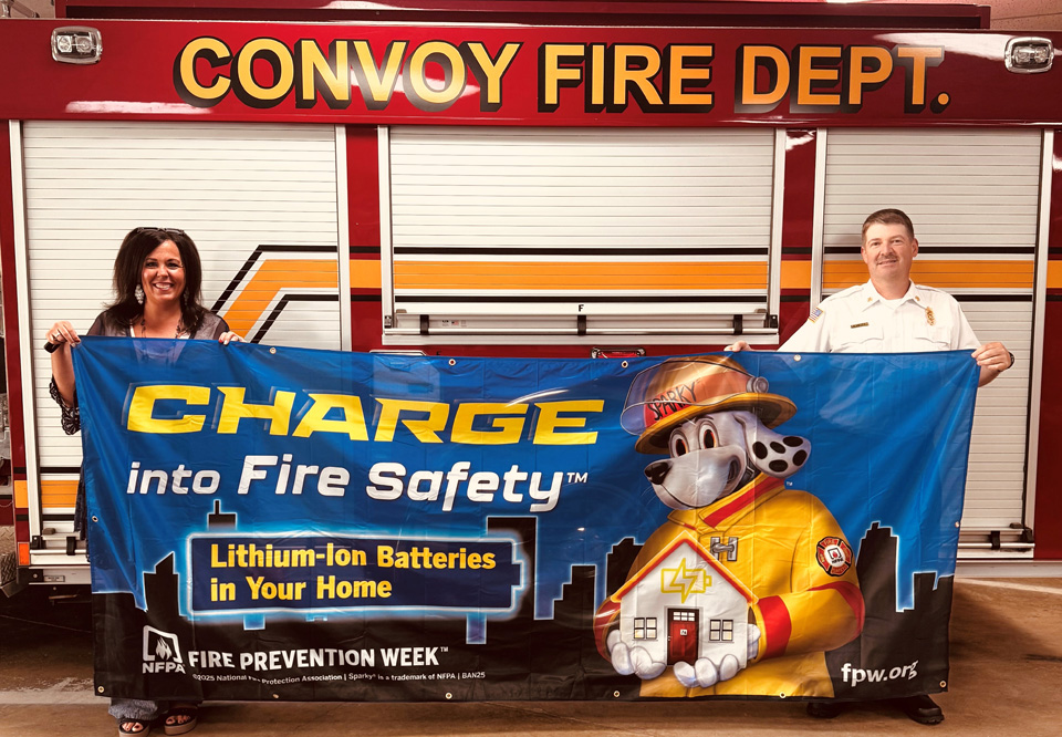 The Van Wert and Convoy Fire Departments are teaming up with State Farm and the National Fire Protection Association to promote Fire Prevention Week October 5-11, and this year’s theme, “Charge Into Safety: Lithium-ion Batteries in Your Home.” This year’s focus on lithium-ion batteries works to better educate the public about how to buy, charge, and dispose of/recycle them safely.