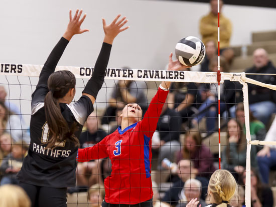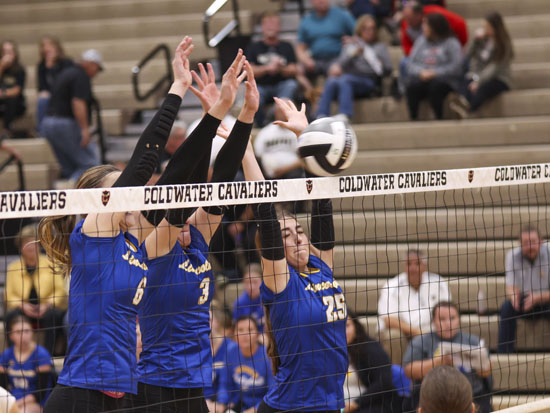 Above, Lincolnview’s Kara Suever (6), Annabel Horstman (3), and Ella Elling (35) converge to block Parkway at the next during Thursday night’s Division VI sectional final game against the Panthers. Below, Crestview’s Kaci Gregory (3) tries to send the ball over the net vs. Parkway in the second sectional final match of the night. The Lancers lost to the Cavaliers 3-1, and the Knights fell to the Panthers 3-0,  ending Lincolnview’s and Crestview’s respective seasons. Wyatt Richardson/Van Wert independent