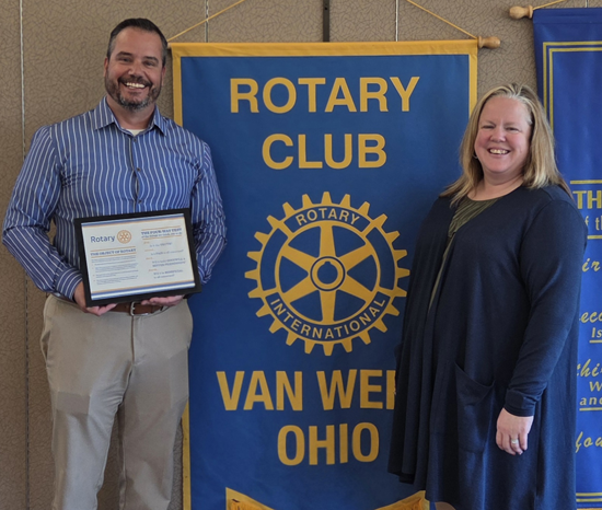 The Van Wert Rotary Club has announced the induction its two newest members, Sam Jordan (above left), Marketing Director at Homestead at Towne Center, and Crestview Local Schools Superintendent Matt Dube (below left). Jordan was officially welcomed into the club by Rotary Club Secretary Amanda Schulte (above right), and Dube was sponsored by Rotarian Niki Wrasman and inducted by District Governor Pamela Brumbaugh during her recent club visit. The Van Wert Rotary Club continues to welcome professionals and community leaders who are dedicated to making a positive impact locally and globally. Meeting are held weekly and membrs engage in a wide range of community service projects, including youth leadership development, educational scholarships, and partnerships with local nonprofits. Photos submitted