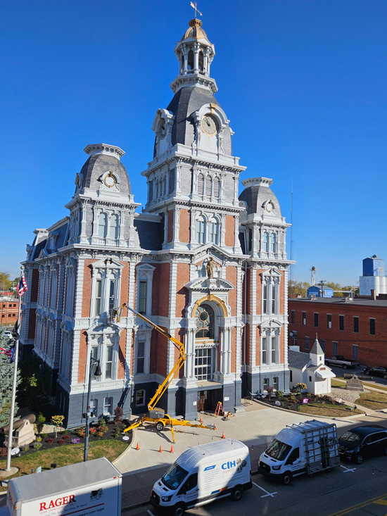 The Van Wert County Courthouse is getting a facelift of sorts, as windows are being refurbished or replaced on all three floors. On Monday, new front doors were installed at the courthouse. Photo courtesy of Thad Lichtensteiger