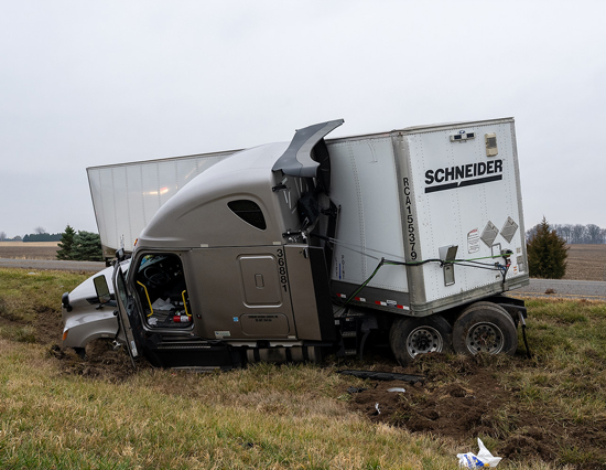 This semi-truck wound up in a rather unnatural position in the median along U.S. 30, near Ohio 49. The accident occurred at approximately 3:20 p.m. Tuesday, when the truck left the inside lane of westbound 30, drove into the median about 200 feet and hit a residential median crossover. It then continued west in the median another 200 feet before jackknifing and coming to a stop. The driver was transported for medical treatment by Convoy EMS. The accident was investigated by the Ohio State Highway Patrol. Bob Barnes photo