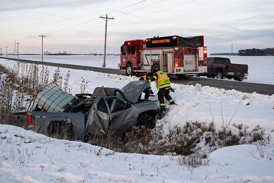Middle Point Fire Rescue and EMS units were called to the scene of a single vehicle accident at Convoy Rd. and Slane Rd at around 4:25 p.m. Monday. A Chevrolet Sierra pickup truck was eastbound on Convoy Rd. when it went off the left side of the road, approximately 200 feet from the intersection. It traveled on in a snow covered field and when it neared Slane Road it hit a roadside ditch and came to rest. The driver was removed from the truck and quickly transported by EMS to St. Rita’s Hospital in Lima. The Van Wert County Sheriff’s Department and the Ohio State Patrol were at the scene as well. OSHP is investigating the accident. Bob Barnes photo
