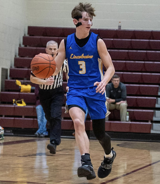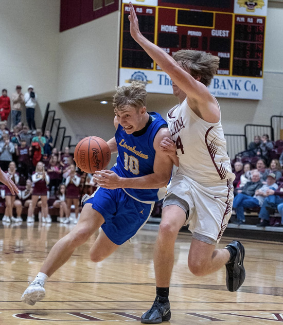Lincolnview’s Gavin Evans (10) powers his way to the basket, while Zander Coil (3) brings the ball upcourt during Monday night’s game against Kalida. The Lancers won the game in overtime, 71-62, and improved to 7-1 on the season. Photos courtesy of Hanna Young