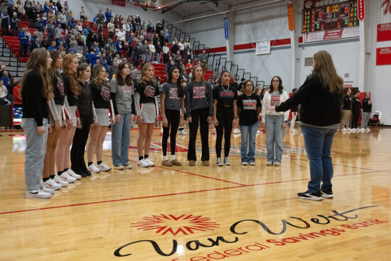 Members of the Van Wert High School Select Choir sing the National Anthem prior to Saturday’s basketball games against Lincolnview. The choir sang it twice – once before the girls game and once before the boys game. The two teams split, with Lincolnview winning the girls game and Van Wert winning the boys game. Full game stories, statistics and pictures can be found on the Sports page. Bob Barnes/VW independent
