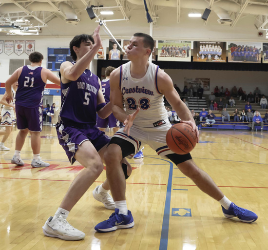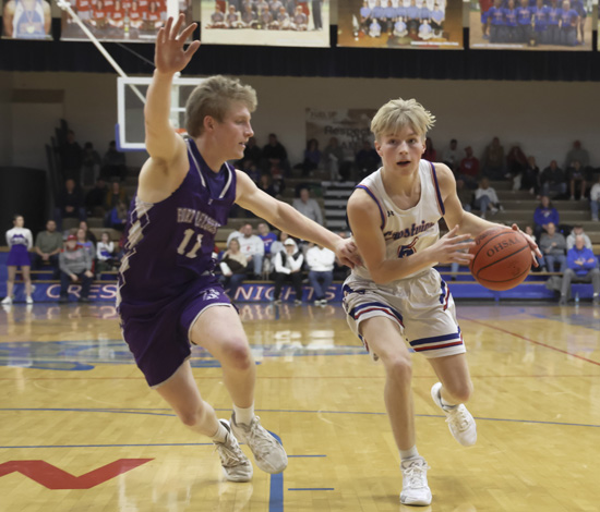 Crestview’s Hudson Perrott (above) and Will Sheets (below) work their way to the basket during Saturday’s non-conference game against Fort Recovery. The Knights put the wraps on a 2-0 weekend with a 65-61 win over the Indians. Crestview (9-6) will host Delphos Jefferson on Friday, then will travel to Celina on Saturday. Wyatt Richardson/VW independent