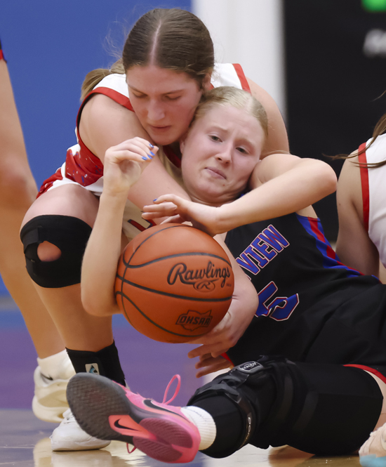 Crestview’s Payton Hoffman (5) and a Wayne Trace player jockey for control of the ball during Tuesday night’s game between the two non-conference rivals. The Lady Knights got the win on the road, 43-37, making it four straight wins for Crestview (11-9). Wayne Trace dropped to 16-5. Crestview’s Kaci Gregory led all scorers with 27 points, including 15 in the fourth quarter. Lexi Moore led Wayne Trace with 15 points. Wyatt Richardson/Van Wert independent