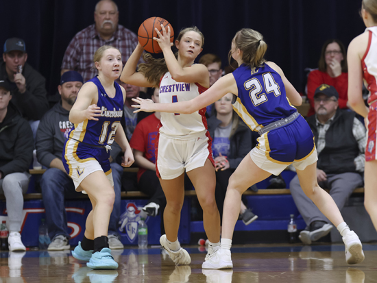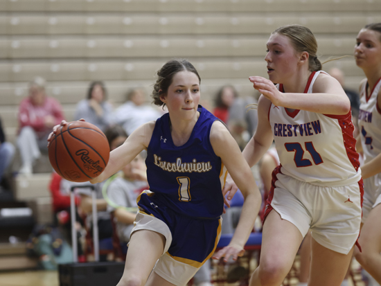 Crestview’s Zoey Ross (above) is double teamed by Lincolnview’s Keira Breese (12) and Brooklyn Byrne (24), while below, Joey-Kate Carey tries to drive by Crestview’s Kenzie Harting. The two teams met in the regular season finale at Ray Etzler Gymnasium Thursday night, and Crestview pulled away for a 50-38 victory. The Lady Knights were led in scoring by Kaci Gregory, who had 16 points, and Peyton Hoffman, who scored 15 points. Breese led all scorers with 17 points. Both teams will open Division IV sectional play next Thursday night, with Crestview (12-9, 4-3 NWC) hosting Antwerp and Lincolnview (9-13, 1-6 NWC) will play at Fairview. Wyatt Richardson/Van Wert independent