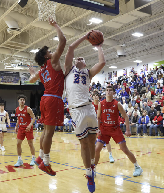 Liam Putman (1) of Crestview looks up at a sky high Xavier Pernell, while Will Sheets (23) powers his way to the basket against the Thunderbirds. The Knights came up short in the regular season finale, losing 71-56 on Friday. See the recap above for more details. Wyatt Richardson/Van Wert independent