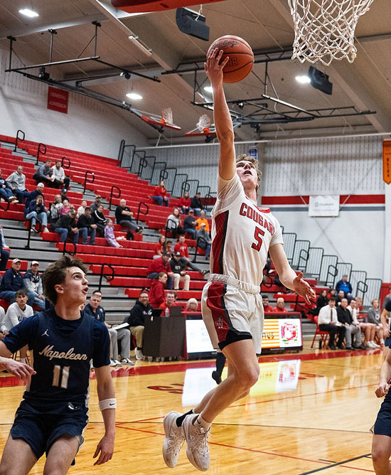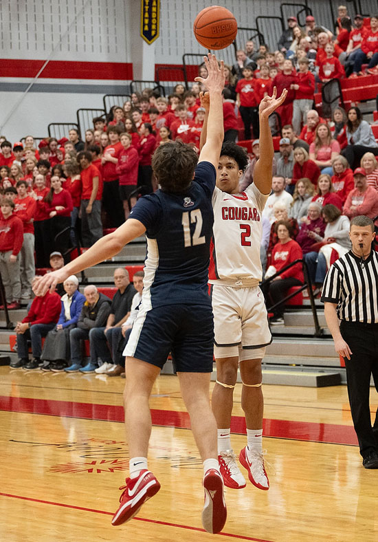 Van Wert’s Keaten Welch (above) goes in for a layup during Thursday’s Division IV sectional championship game against Napleon while below, Xavier Kelly puts up a jump shot against the Wildcats. The Cougars won the game 52-37. Bob Barnes/Van Wert independent