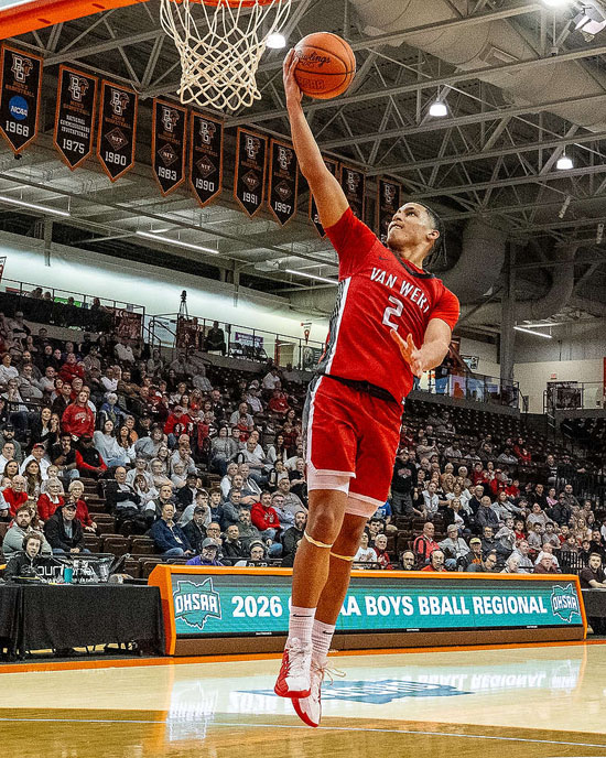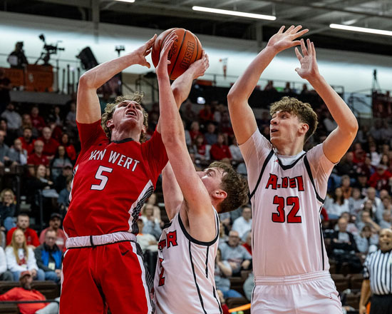 Van Wert’s Keaten Welch (5) tries to fight through a double team against Jonathan Alder. Xavier Kelly (2) soars to the basket and Zach Crummey (23) mixes it up inside during Wednesay night’s Division IV regional semfinal game at Bowling Green State University. Unfortunately for the Cougars, the Pioneers were too much to handle and won the game 63-45. Bob Barnes/Van Wert independent