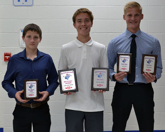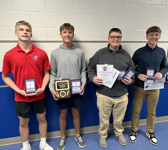 Special awards (picture No. 1): Levi Hoblet (Most Improved), Lincoln Smith (Most Valuable Performer, Senior Award), Andy Heth (Coaches Award, Golden Guts Award). Not pictured: Jake Heth (Senior Award), Xavier Tyas (Senior Award). Boys NWC Scholar-Athletes (picture No. 2): Row 1 – Kale Vining, Derek Young, Drayden Hoffman, Ian Owens. Row 2 – Caleb Thomas, Luke Sawmiller, Lincoln Smith, Hudson Perrott, Andy Heth.