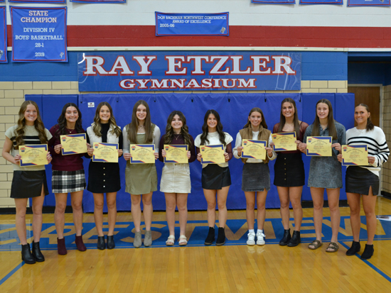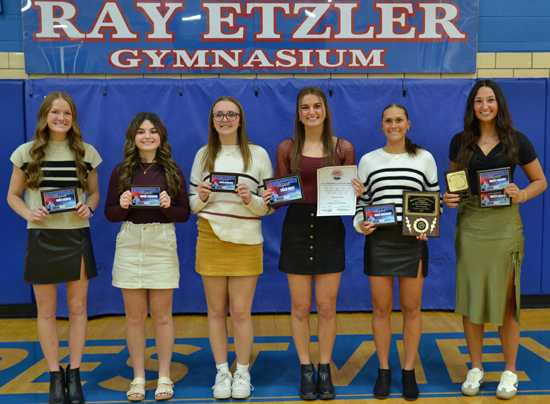 Special awards (picture No. 3): Anna Gardner (Coaches Award, Golden Guts Award, Senior Award), Chloe Miller (Most Improved), Emily Heth (Most Valuable Performer). Girls NWC Scholar-Athletes (picture No. 4): Ava Motycka, Marlee Temple, Chloe Miller, Taylor Kittle, Emily Heth, Anna Gardner.