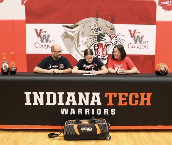 Van Wert High School senior Reagan Horine recently signed a letter of intent to bowl at the collegiate level at Indiana Tech. Horine qualified for the OHSAA state tournament as a junior and is expected to lead the Cougars during this upcoming season. She was joined by her father, Joe Horine and her mother, Amanda Park at the signing ceremony. Fort Wayne-based Indiana Tech is a member of the NAIA and the Wolverine-Hoosier Athletic Conference. Photo submitted