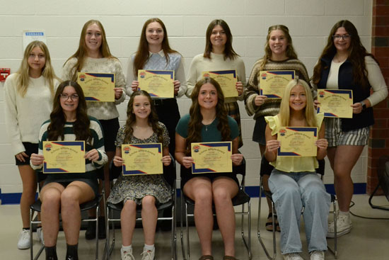 The Crestview soccer program recently held its postseason awards ceremony to recognize athletes for their hard work throughout the season. Coach Cindy Lamb and her staff presented Northwest Conference achievements and special awards during the event. NWC Scholar Athletes (above, row 1): Ella Lamb, Emily Foudy, Dakota Thornell, Cylee Grubb. Row 2: Tori Singer, Madi Springer, Emily Adams, Rain Risley, Kenzie Heffner, Evie Lamb. Special awards (below, row 1): Emily Adams (Coach’s Award); Dakota Thornell (Coach’s Award); Marissa Gros (Most Improved, Honorable Mention NWC). Row 2: Ellie Ward (Offensive Award, Most Goals, first team NWC, district second team); Evie Williman (most assists, second team NWC, district honorable mention); Cylee Grubb (most improved); Ella Lamb (most saves, first team NWC, district honorable mention); Madi Springer (defensive award, honorable mention NWC, district honorable mention), and Rain Risley (Coach’s Award). Photos submitted
