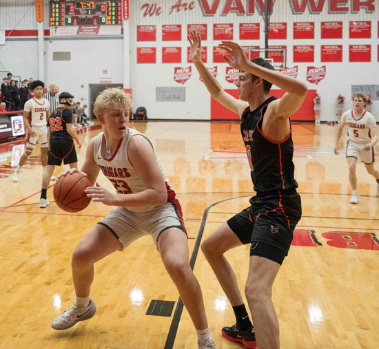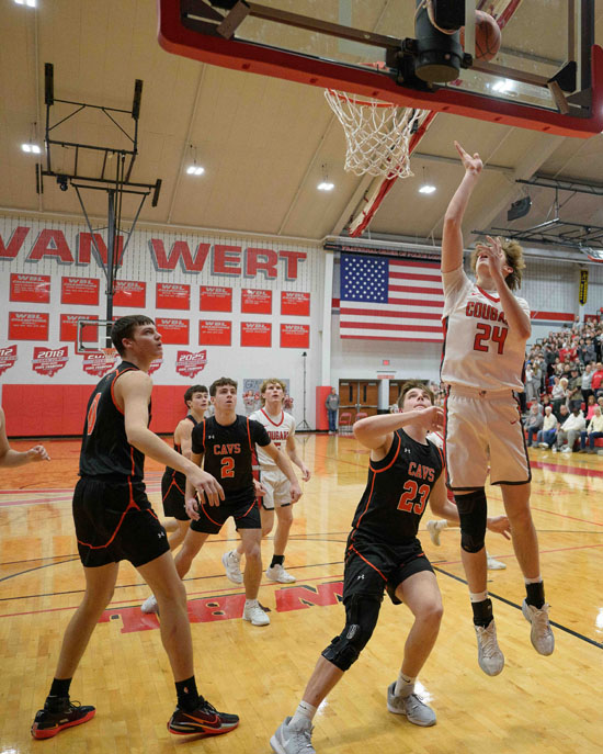 Van Wert’s Zach Crummey (23) sizes up Coldwater’s 6-10 sophomore Jack Bruns. Cohen Bragg (24) uses the glass for two points against the Cavaliers and Xavier Kelly (2) delivers a pass during Saturday’s game against Coldwater. The Cougars won the game 54-42. Bob Barnes/VW independent