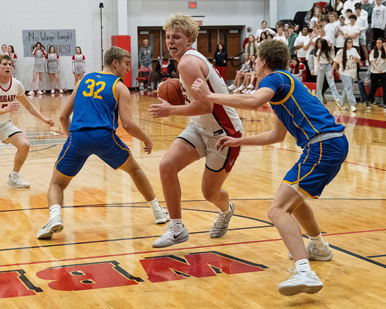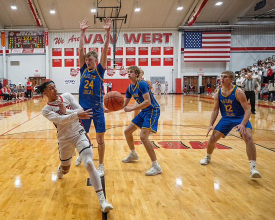 Xavier Kelly (2) passes the ball during Saturday’s game against Marion Local. Zach Crummey (below) is sandwiched by Flyer defenders and Keaten Welch (5) finds himself looking up against the Flyers. Marion Local won the game 45-32. Bob Barnes/VW independent