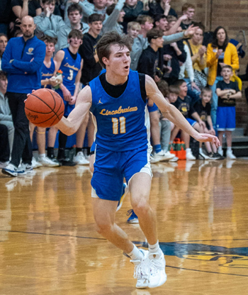 Gavin Evans supplied seven of Lincolnview’s first quarter points but despite foul trouble, Cameron Elwer countered with 10 points of his own, while Andrew scored eight. Things changed in the second quarter, when Delphos St. John’s went on a 15-0 scoring run, which included 10 points by Andrew Elwer, and the Blue Jays took a 23-point lead into halftime, 48-25.