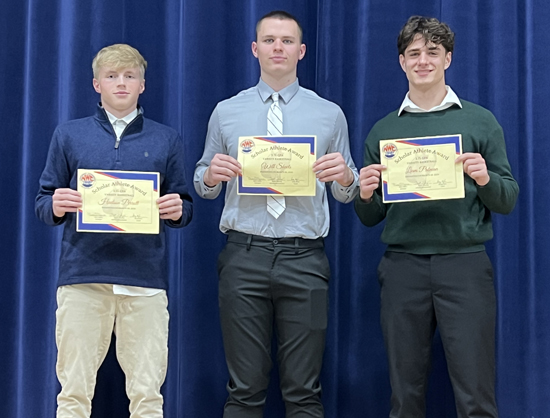 The Crestview boys basketball program recently concluded its season with head coach Doug Etzler and his coaching staff, recognizing various accomplishments throughout the season, which ended at the Division VI regional semifinals. NWC Scholar-Athletes (above, left to right): Hudson Perrott, Will Sheets and Liam Putman. Not pictured: Denver McDougall. Special awards (below): Cash Hammons (70 percent Free Throw Club), Liam Putman (Defensive Award), Hudson Perrott (Hustle Award), Hayden Perrott (Most Assists, Offensive Award, NWC Second Team, District 8 Second Team, All-Northwest District Third Team, All-Ohio Honorable Mention), Will Sheets (Most Rebounds, Offensive Award, NWC Second Team, All-Northwest District Honorable Mention), Huxley Grose (Knight Pride Award), Braxton Leeth (Knight Pride Award), Owen Heckler (Most Improved). Not pictured: Denver McDougall (Most Improved). Photos submitted