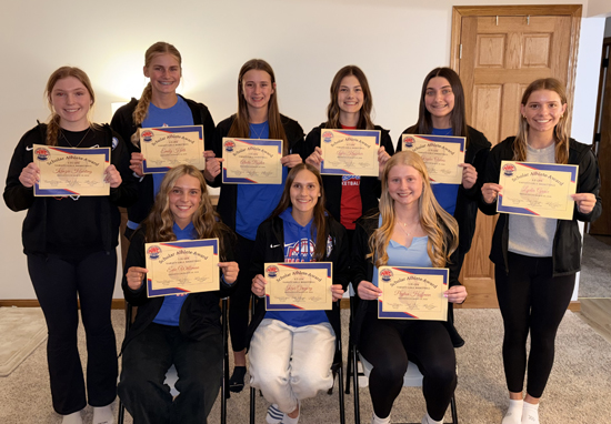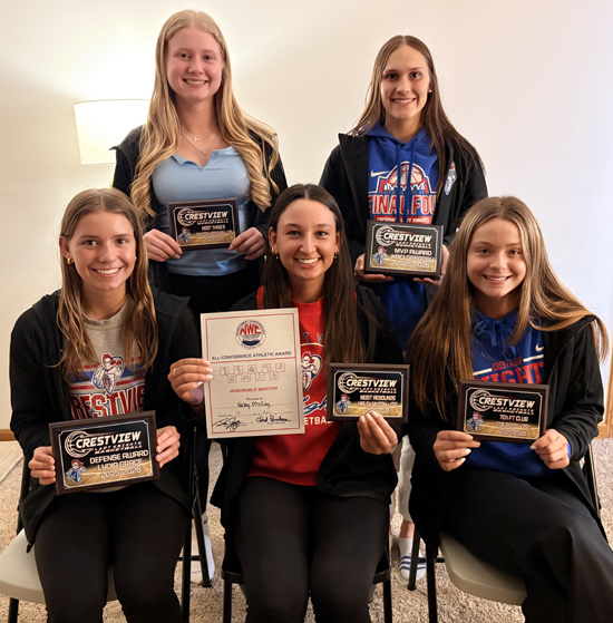 The Crestview girls basketball program concluded its season with head coach Mark Gregory and his coaching staff recognizing the team’s accomplishments throughout the season. Scholar-Athletes (above, row 1, left to right): Evie Williman, Kaci Gregory and Peyton Hoffman. Row 2: Kenzie Harting, Emily Heth, Alecta Baxter, Ayla Kreischer, Kaylee Owens and Lydia Grace. Not pictured is Lillie Best. Special Awards: (below, row 1, left to right): Lydia Grace (Defense Award), Haley McCoy (Most Rebounds, NWC Honorable Mention), Zoe Ross (70 percent Free Throw Club). Row 2: Peyton Hoffman (Most 3s, NWC Honorable Mention), Kaci Gregory (Most Steals, Most Assists, 70 percent Free Throw Club, MVP Award, NWC First Team, All-Northwest District First Team, All-Ohio Honorable Mention). Not pictured: Lillie Best (Knight Awards, NWC Honorable Mention). Photos submitted