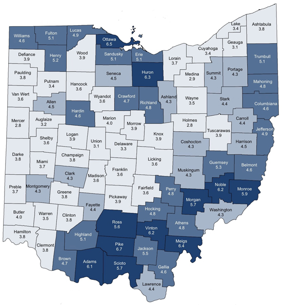 Seven counties had unemployment rates above six percent in December. The counties with the highest rates, other than Pike were: Ottawa, 6.5 percent; Meigs, 6.4 percent; Huron, 6.3 percent; Noble and Vinton, 6.2 percent, and Adams, 6.1 percent.