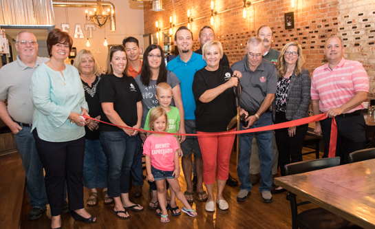 Cheryl and Frank Bowen get ready to cut the ribbon on the new downtown Brewed Expressions coffee shop on West Main Street as family, staff, and Chamber board members look on. Dave Mosier/Van Wert independent
