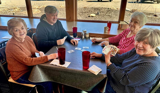 The upbeat gathering set an encouraging tone for the months ahead, with plenty of stories, laughter, and fellowship. As a special highlight, Chuck White offered a brief presentation on Turo, the fast-growing car-sharing platform often described as an “Airbnb for cars.” Several retirees stayed afterward to enjoy a few friendly games of cards. Pictured below are (front row): Dorothy Helmke and Sue Karst. Rear: Phil Steinen and Linda Holden